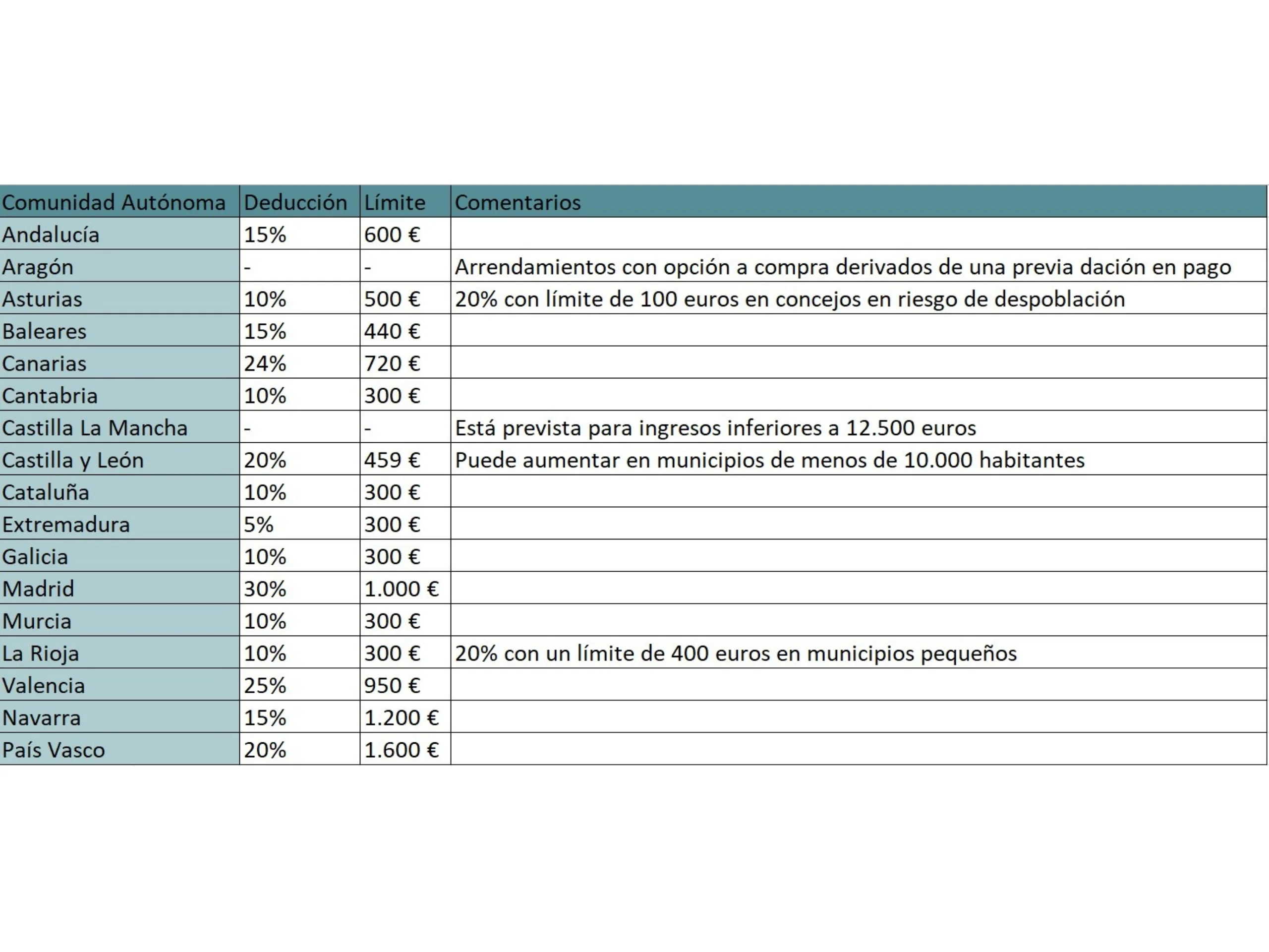 Aquí puedes ver una tabla por Comunidad Autónoma de la desgravación del alquiler.