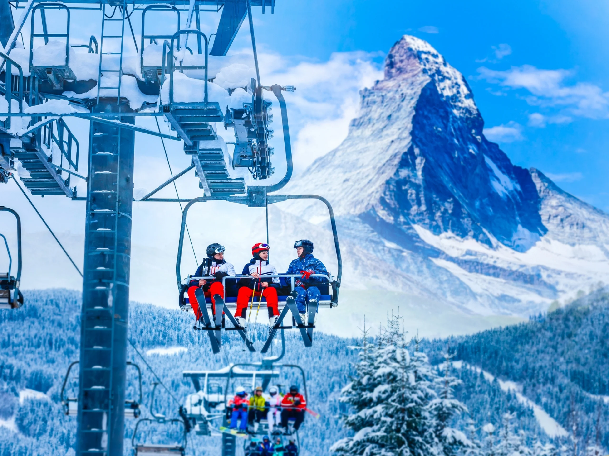 Esquiadores en telesilla con el monte Zermatt de Suiza detrás